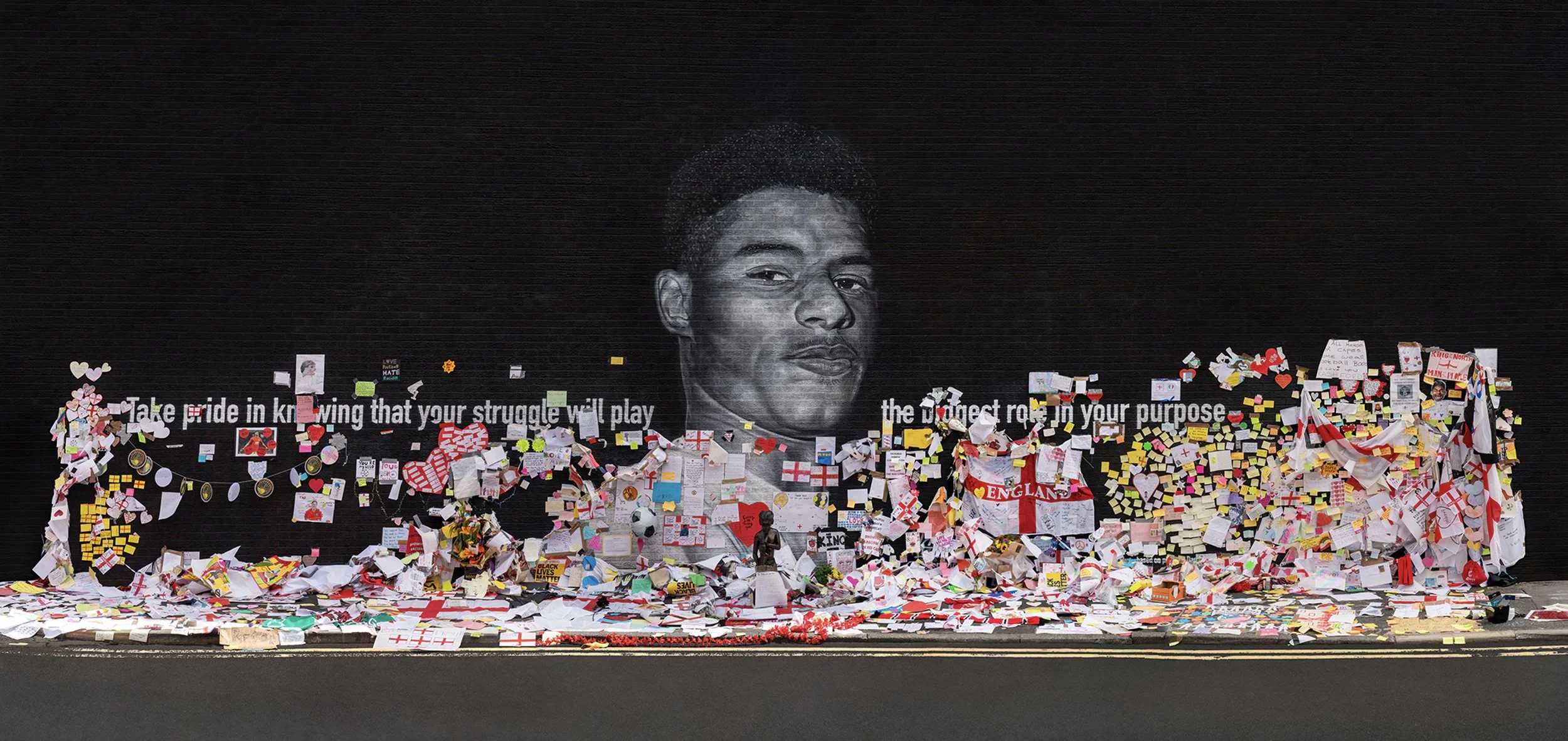 In 2021, following the penalty shootout loss in the UEFA Euro final, the mural was defaced with offensive messages, and England's black players, including Rashford, faced racist abuse online. The community in Withington responded by initially covering the vandalism with bin bags and subsequently with heartfelt messages of love and support, which snowballed into thousands of messages from the wider community and a collective demonstration of solidarity and resilience. This powerful response highlighted the strength of support for Marcus and a united stand against racism and online hate.